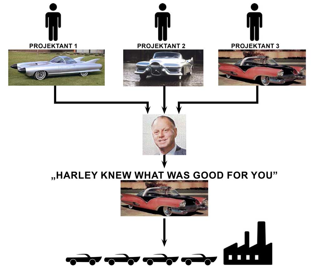 Co to oznaczało dla biura projektowego? Że Earl jako głowa działu był filtrem wszystkich projektów. Każdy projekt musiał przejść przez jego ręce. Młodzi projektanci starali się przewidzieć nadchodzące trendy ale to od szefa zależało czy ich wizje mają prawo bytu. Następnie zatwierdzone projekty szły dalej na produkcję. Pojawiło się nawet powiedzenie „Harley knew what was good for you” – Harley wiedział co jest dobre dla ciebie. A jak przeczytasz z amerykańskim akcentem to się nawet rymuje: Harli nju łot łos gud for ju.