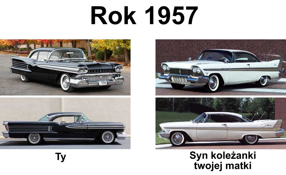 Rok 1957 pokazał jak w tyle został General Motors. Ich auta wyglądaja ociężale, a chrom tylko je bardziej przygniata. Im droższe auto z linii modelowej bym bardziej dobija swoją bryłą. Dlatego Chevy z 57 jest kultowy ale wszyscy starają się zapomnieć o Buickach, Oldsach i Cadillacach z tego rocznika. Natomiast Chrysler? Pokazali swoje „Forward thinking” (myślenie na przód) i ich auta inspirowane rakietami wyglądają na szybsze, smuklejsze, bardziej sportowe, bardziej lekkie, przyjemniejsze. Nawet nie muszą być lepsze bo klient i tak kupuje oczami. A co jest najgorsze? Że kolejne roczniki GM miały być jeszcze bardziej obite chromem. Zrobiła się afera w Detroit i dało się to odczuć w tabelkach sprzedaży. A szef jest nieugięty i dalej wierzy w potęgę chromu.