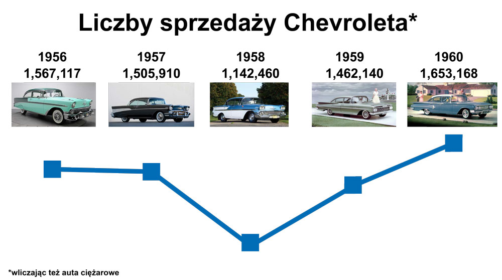 Finalnie tragedia została zażegnana. Kolejne modele od rocznika ’59 są smuklejsze i bardziej dopasowane do mody. Wraca nadzieja w General Motors i cyferki w tabelach księgowych ponownie zaczynają rosnąć.